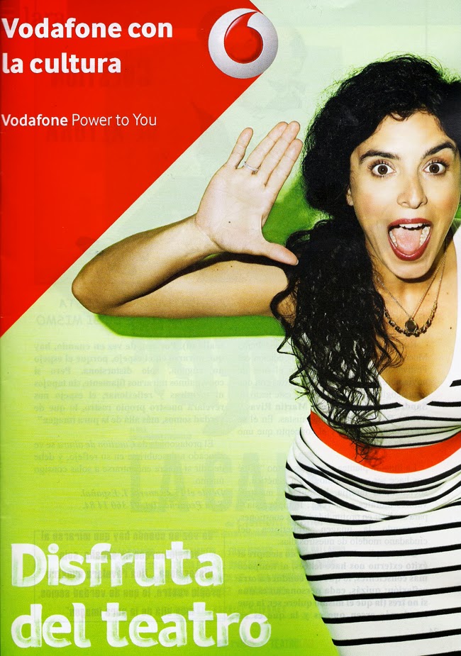 Si hablamos de periodismo es imposible no pensar inmediatamente en los periódicos. En ellos la principal fuente de financiación es la publicidad y por ello es prácticamente imposible encontrar un periódico sin publicidad. Para ello encontramos un anuncio de Vodafone donde la empresa intenta mostrarse como una marca a favor de la cultura. Para ello utiliza el lema «Vodafone con la cultura» y elige la imagen de una persona joven, intentando probablemente llamar la atención del público joven. El sector cultural que está intentando fomentar en este caso es el teatro, posicionándose a su lado debajo de la imagen principal.